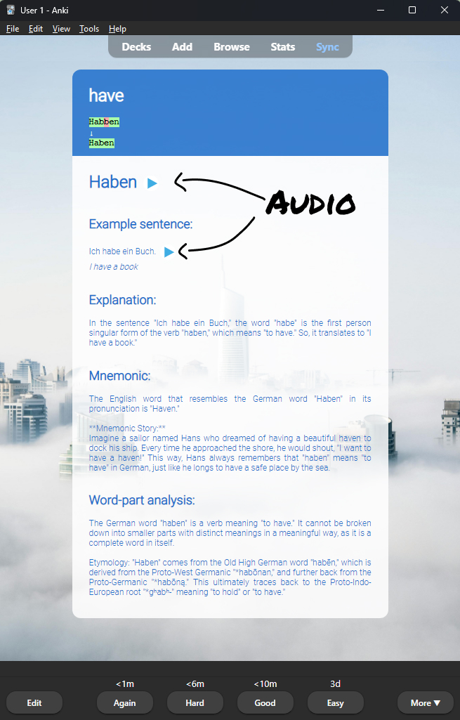 Here is a flashcard from the German deck. Keep in mind, they are customizable. You can change the layout however you want.